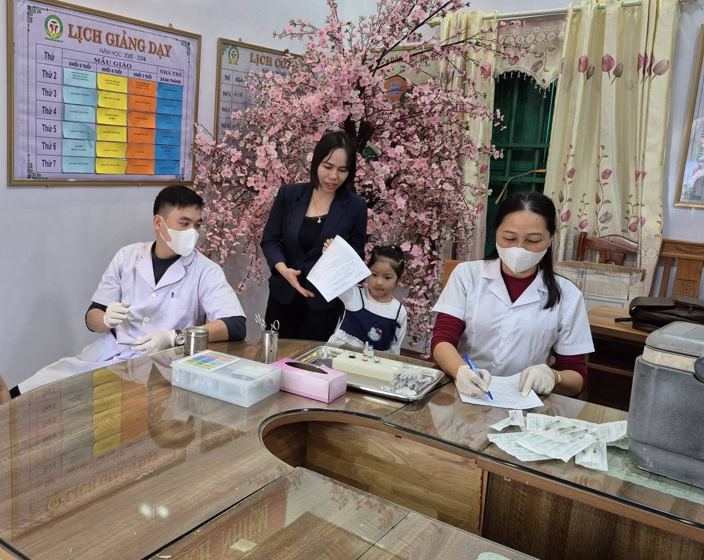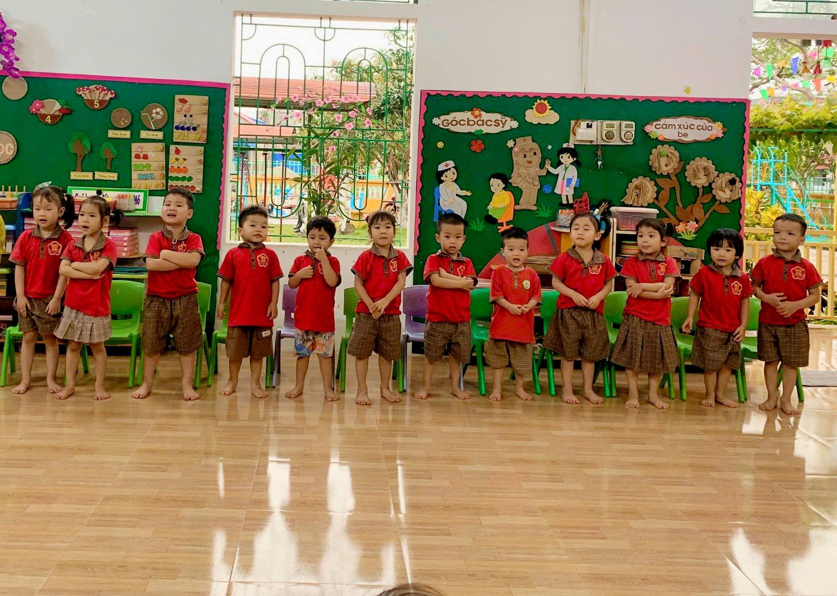 Hàng năm nhà trường phối hợp với trạm Y Tế tổ chức khám sức khoẻ, cân, đo vào biểu đồ tăng trưởng cho trẻ, từ đó cân đối chế độ nuôi dưỡng, chăm sóc hợp lý. Công tác nuôi dưỡng và vệ sinh an toàn thực phẩm cho trẻ được nhà trường đặc biệt quan tâm hàng đầu. Nguồn thực phẩm cung cấp cho các bếp được hợp đồng chặt chẽ đảm bảo vệ sinh an toàn thực phẩm. Các bếp ăn của trường được thiết kế theo quy trình một chiều và được. Hàng năm tỷ lệ trẻ suy dinh dưỡng cuối năm của trường giảm so với đầu năm từ 2 – 3%. 100% các cháu đều đạt bé khỏe mạnh, chăm ngoan.